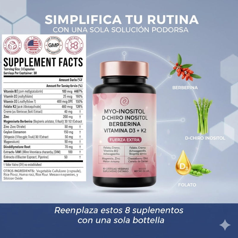 Con una potente combinación de Myo-Inositol, D-Chiro Inositol, Berberina y D3+K2, esta fórmula de fuerza extra te ofrece un apoyo holístico y superior para tu equilibrio hormonal, simplificando tu rutina de bienestar.