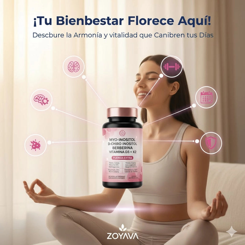 Nuestra fórmula de Fuerza Extra combina Myo-Inositol, D-Chiro Inositol, Berberina y Vitaminas D3+K2 para un apoyo integral. Esta sinergia optimiza tu sistema hormonal, ofreciendo resultados duraderos y una vitalidad renovada.